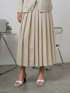 Rok pleats dengan detail pinggang yang fit sampai ke pinggul.
